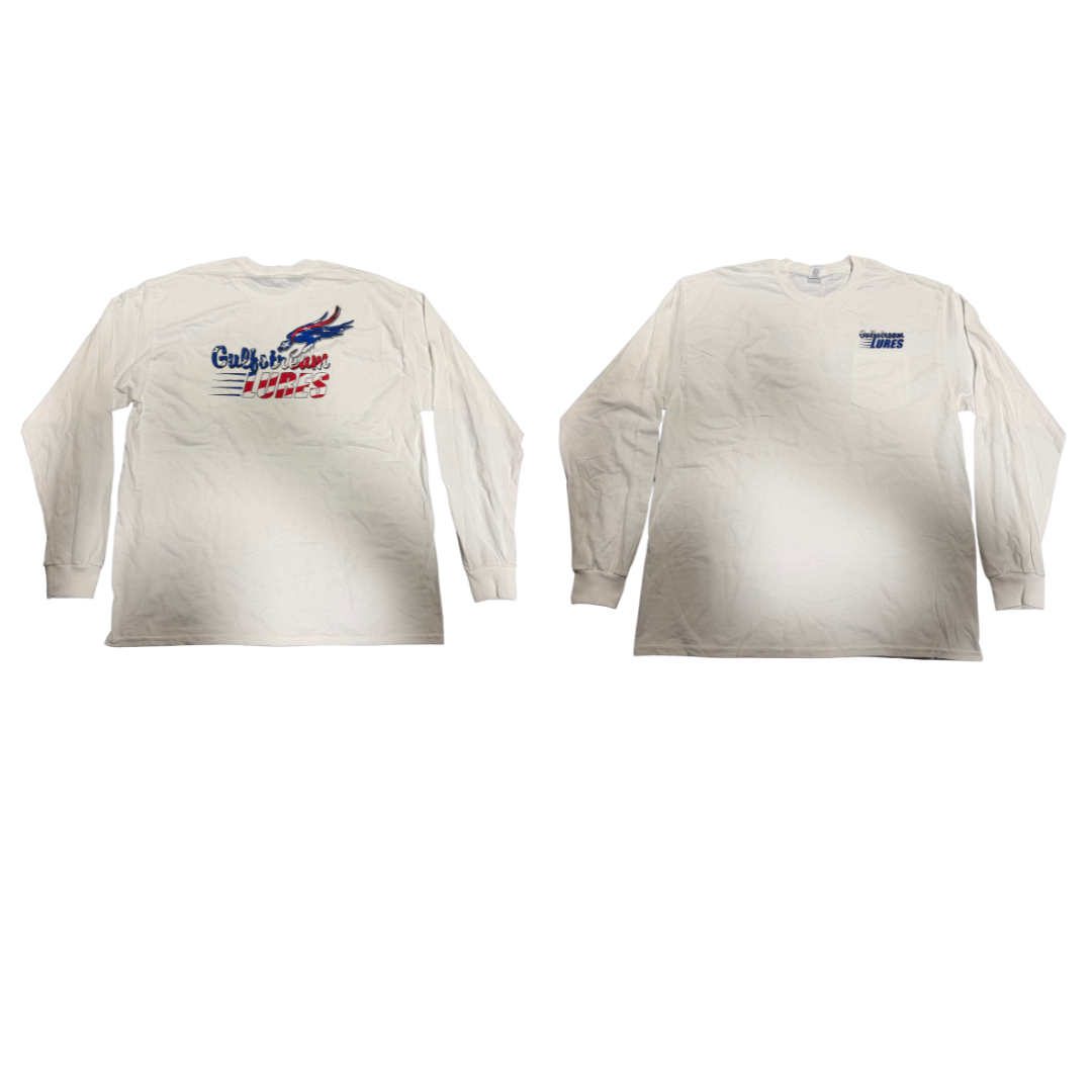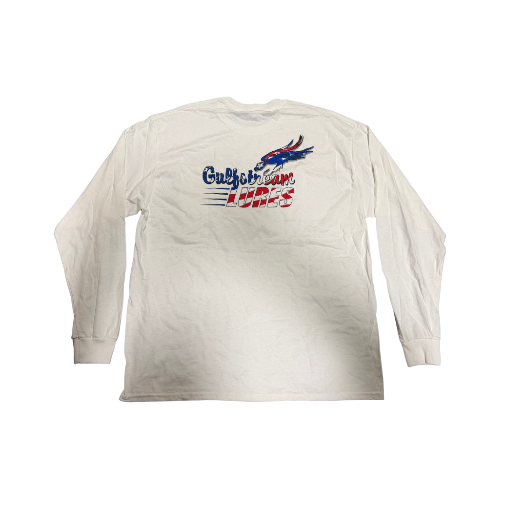 Long sleeve white T-shirt with Gulfstream’s classic hawk logo done in a patriotic style with stars and red, white and blue stripes on the back of the shirt. Gulfstream Lures logo in blue over front pocket. Made of 100 percent cotton.